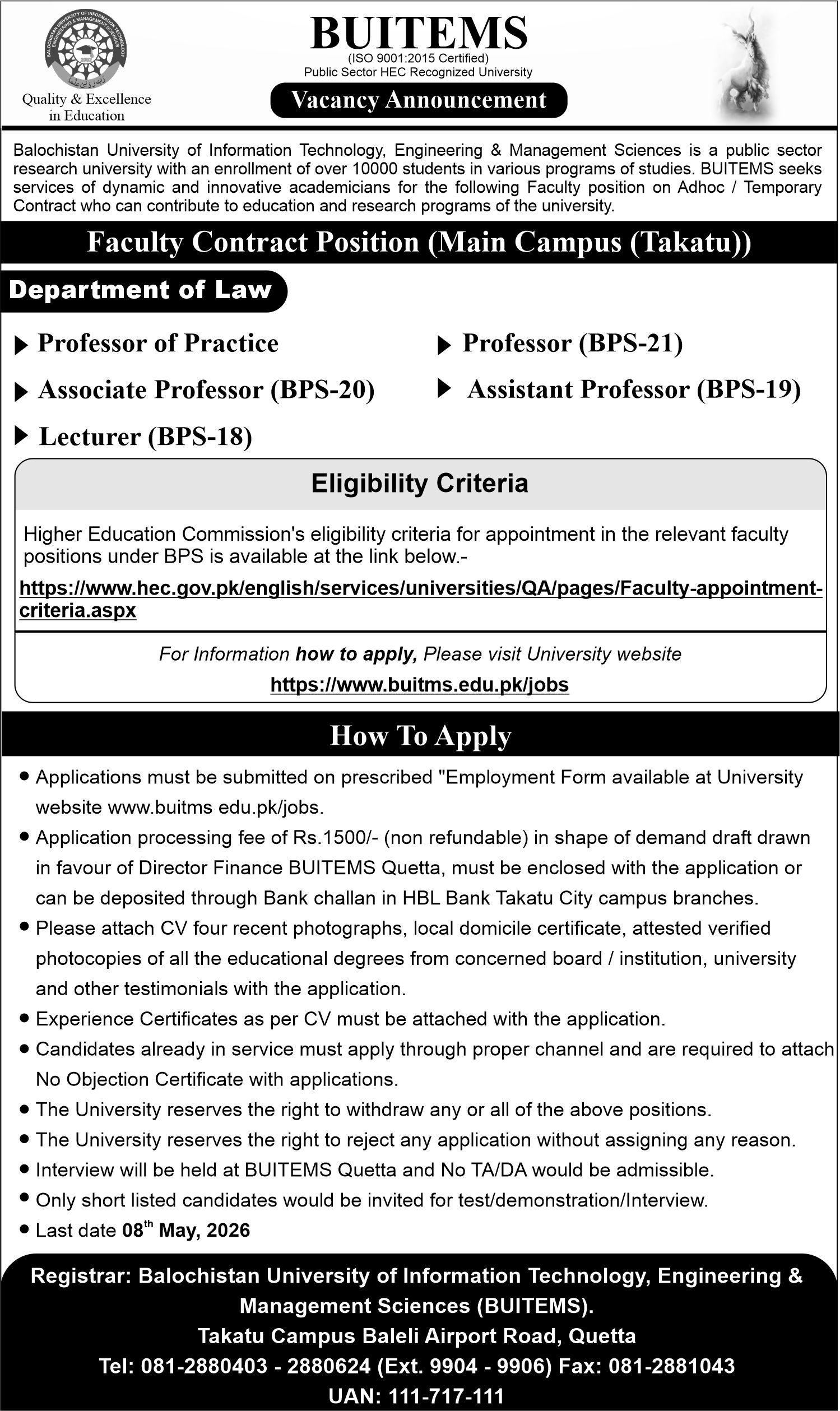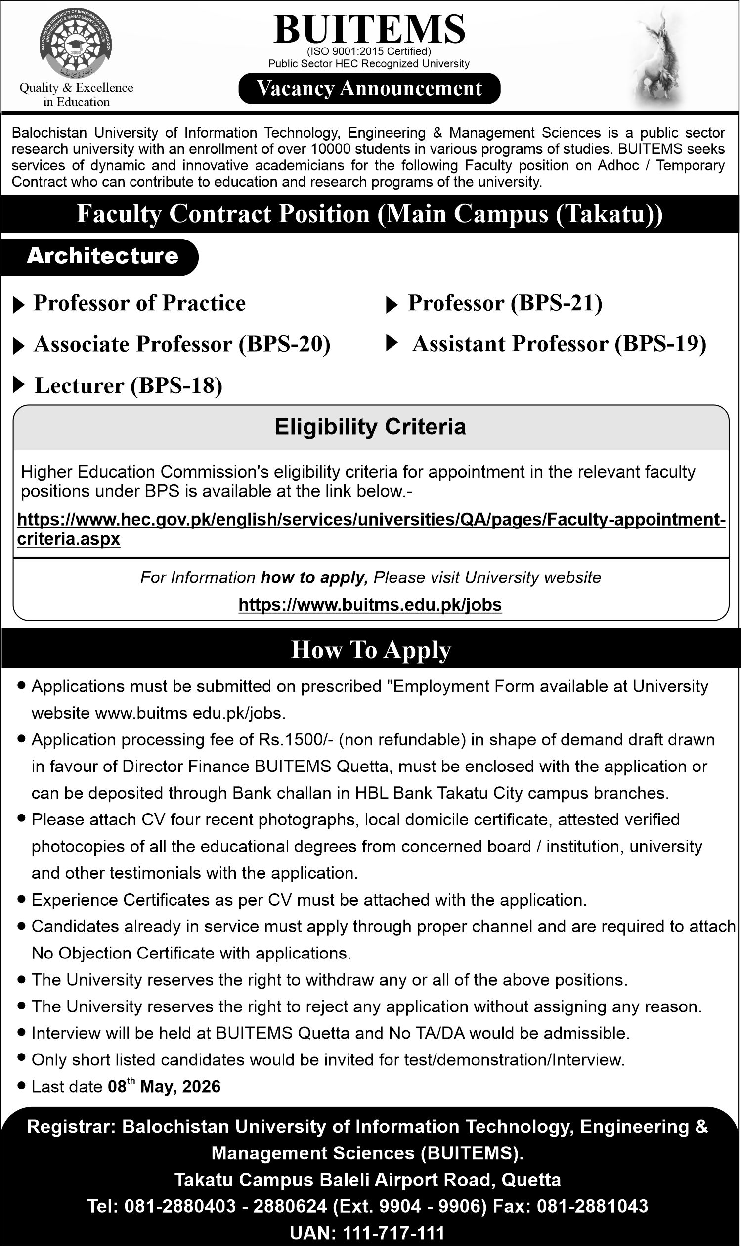With reference to advertisement for the different administrative positions of BUITEMS University College Zhob, the application processing fee for the positions of BPS-16 and below must be deposited @ Rs.1500/-.