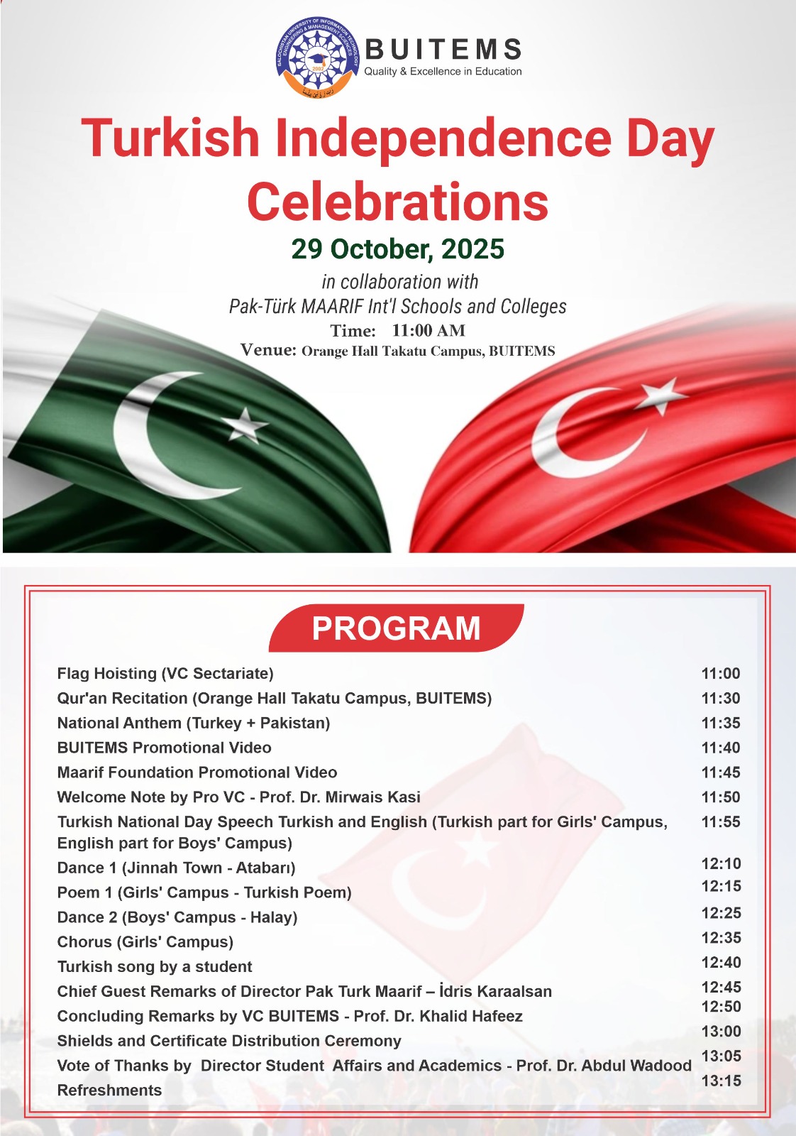 We are pleased to invite you to the Republic Day of Türkiye Celebration organized by BUITEMS in collaboration with Pak-Türk Maarif International Schools and Colleges. 📅 Date: Wednesday, 29th October 2025 🕚 Time: 11:00 AM 📍 Venue: Orange Hall, Takatu Campus, BUITEMS Join us in commemorating this day of friendship and unity between Pakistan and Türkiye — celebrating shared values of education, progress, and cultural harmony.